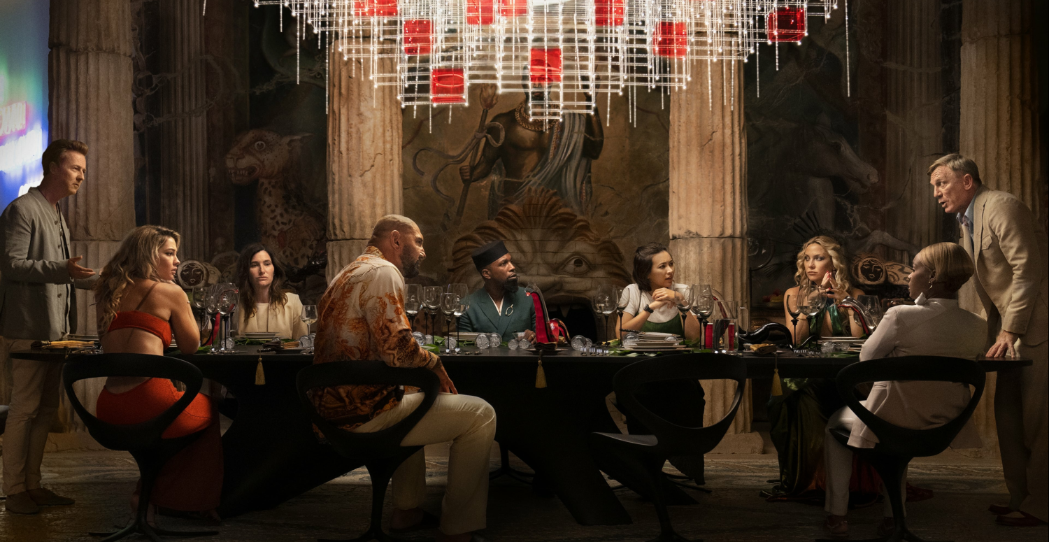 Rian Johnson reprend la même formule avec une intrigue de whodunnit (qui a fait le coup ? les films à énigmes style Agatha Christie) assez classique dans sa structure – présentation des personnages, des enjeux et du cadre – et une distribution prestigieuse (sans compter plusieurs caméos sympathiques). Car oui le casting est une grande force de ces films dont les personnages travaillés permettent aux acteurs de livrer de remarquables performances et dont la renommée de ces derniers accroît l’intérêt pour le film. Accrochez-vous donc, car ce huis-clos insulaire met en scène Kate Hudson, Kathryn Hahn, Leslie Odom Jr., Dave Bautista, Jessica Henwick, et Madelyn Cline aux côtés d’un excellent duo principal composé d’Edward Norton (Fight Club) et Janelle Monáe (Les Figures de l’ombre).